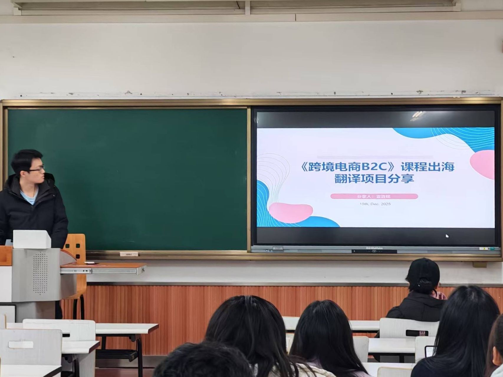 会议核心聚焦于产教融合的实践探索。2024级硕士生袁旌铭以《跨境电商B2C》课程出海翻译项目为例,全景式分享了从项目对接、术语库建设、翻译实操到跨文化调适的全流程实战经验。他不仅深入剖析了该翻译项目的具体难点及解决方案,还现场演示了翻译管理系统(TMS)与计算机辅助翻译(CAT)工具在协同作业与质量控制中的高效应用。晏生宏老师在点评中指出,此类真实项目是翻译能力转化的关键枢纽,有效锤炼了学生的语言技术运用、项目管理和跨文化交际等复合能力,是将学术理论转化为职业竞争力的典范路径。该环节为在场学生提供了极具参照性的实践范本,并引发了关于翻译技术伦理与市场适应性的热烈研讨。