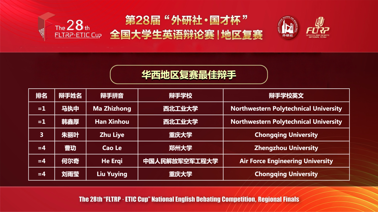 经过两天五轮循环赛的高强度比拼,我校两支队伍分别以第六名和第七名的优异成绩双双斩获赛区金奖,并成功晋级全国总决赛。其中,朱丽叶、刘雨莹荣获“最佳辩手”。