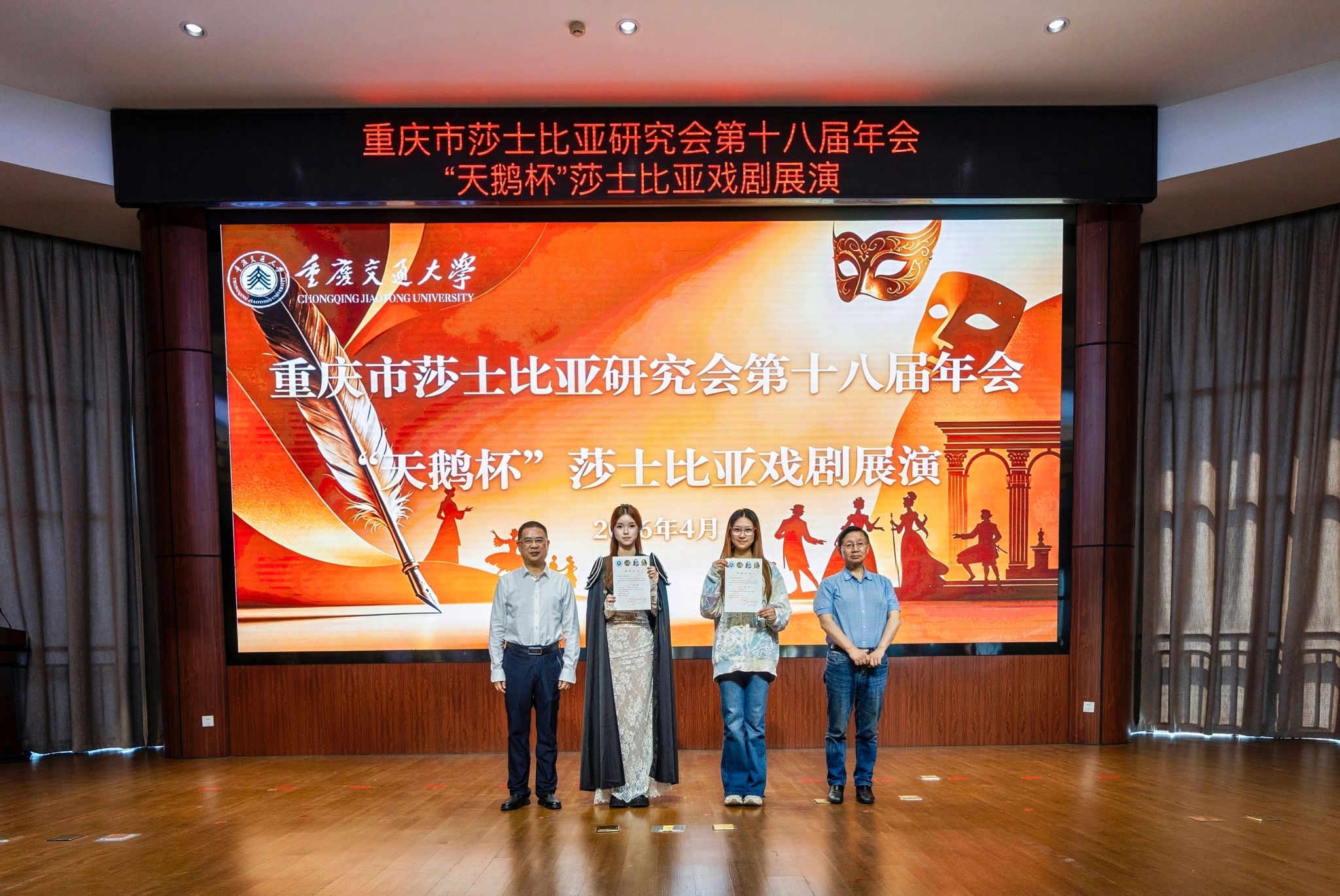2026年4月25日,重庆市莎士比亚研究会第十八届年会“天鹅杯”莎士比亚戏剧汇演在重庆交通大学科学城校区落下帷幕。重庆大学学生英语戏剧社携经典喜剧《仲夏夜之梦》惊艳亮相,凭借扎实的表演功底与对莎翁作品的深刻理解摘得一等奖,为学校赢得荣誉。