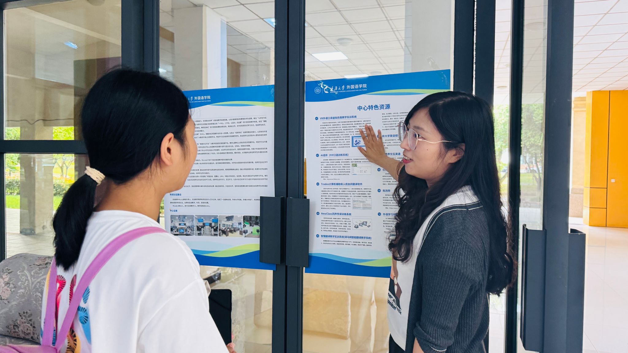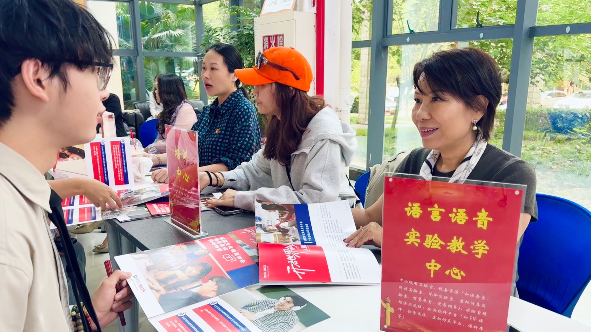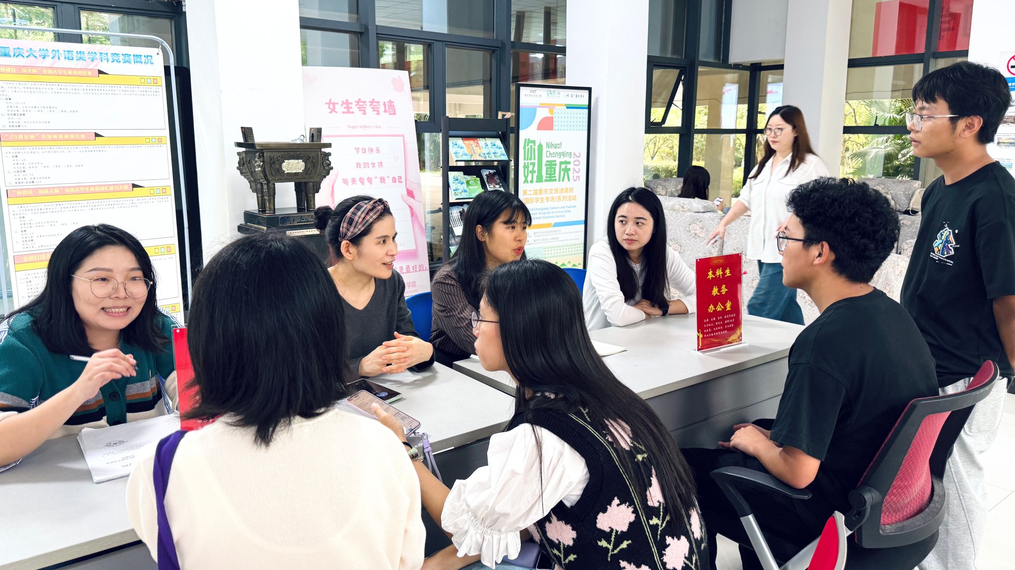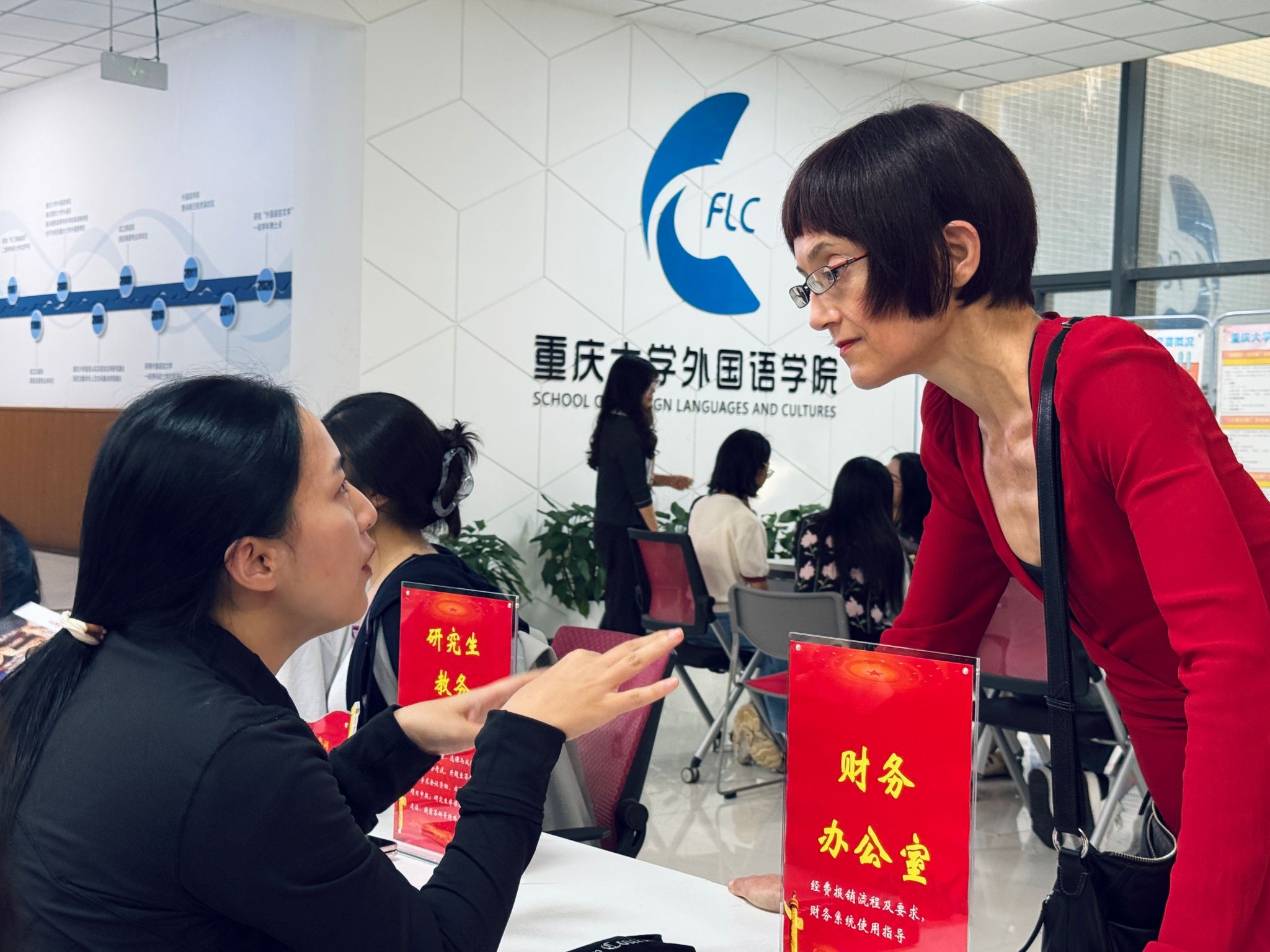 活动当天,学院楼一楼大厅气氛热烈,吸引了众多学生踊跃参与。学院办公室、本科生教务办公室、研究生教务办公室、学生工作办公室、党委办公室、外事办公室、财务办公室、科研办公室、语言语音实验教学中心、培训中心、语言认知与语言应用研究基地及《数字语言文学研究(英文)》期刊编辑部等十余个办公室集中设点,实现“一站式”答疑,活动吸引了本院及其他学院的各年级本科生、研究生以及部分专任教师到场参与。