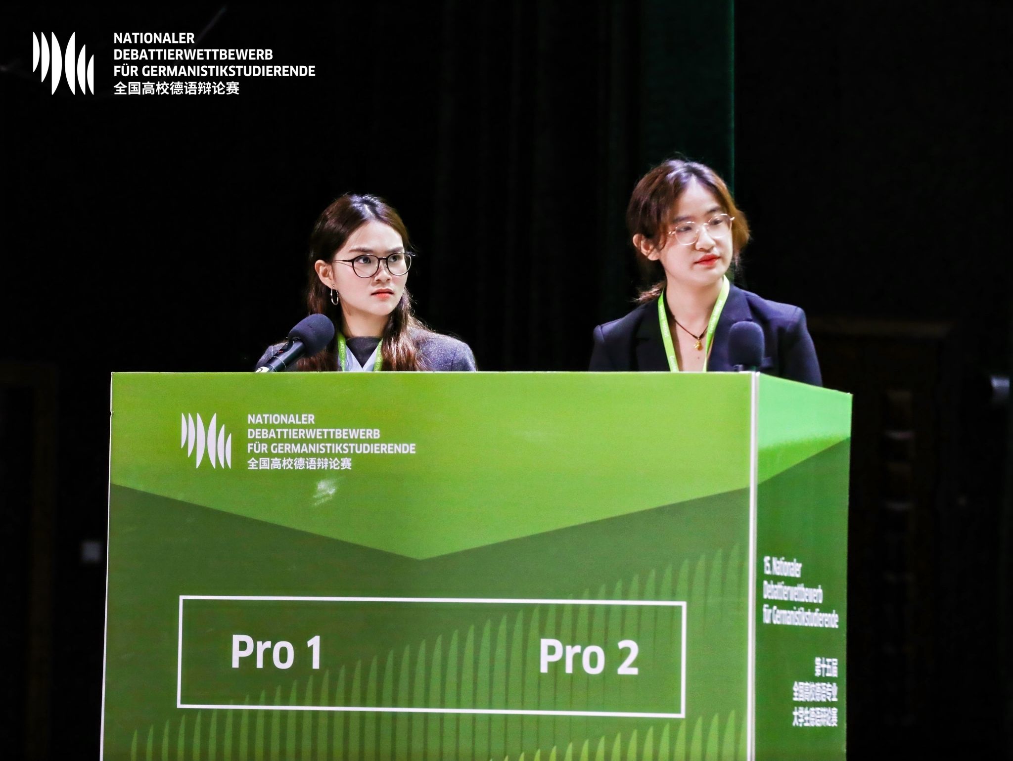 德语专业2023级本科生董张扬、赵子宁组成。决赛中,她们就辩题“Sollen Deepfakes immer Haftstrafen geahndet werden?(深度伪造行为应不应该总是被处以监禁)”持正方立场展开论述。凭借赛前多轮模拟辩论积累的经验,一辩赵子宁迅速构建起逻辑严密的理论框架,以流利德语完成立论陈词,清晰阐述己方核心论点。在自由辩论环节,在外教专项训练中打磨出的听力与反应能力,使她们能在激烈交锋中精准捕捉对方论证的薄弱之处并有效回应了对方的质疑。二辩董张扬则依托对辩论规则的深入钻研,在结辩环节中总结全面、语音标准,进一步深化了辩题的理论层次。